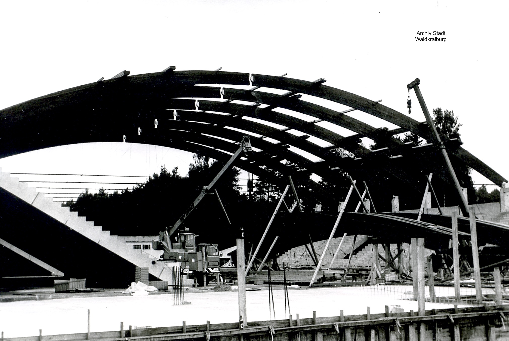 Nur wenige Jahre später, 1971, wurde eine moderne Kunsteisbahn in unmittelbarer Nähe des Jahnstadions errichtet – nach internationalen Standards und ideal für den Eishockeysport. Die Begeisterung wuchs weiter, und so entstand 1975 die überdachte Eissporthalle mit einer Fläche von 30 mal 60 Metern. Die markante Dachkonstruktion aus 13 Holzleimbindern spannt sich 55 Meter weit über die Halle und verleiht ihr bis heute ihren besonderen Charakter.